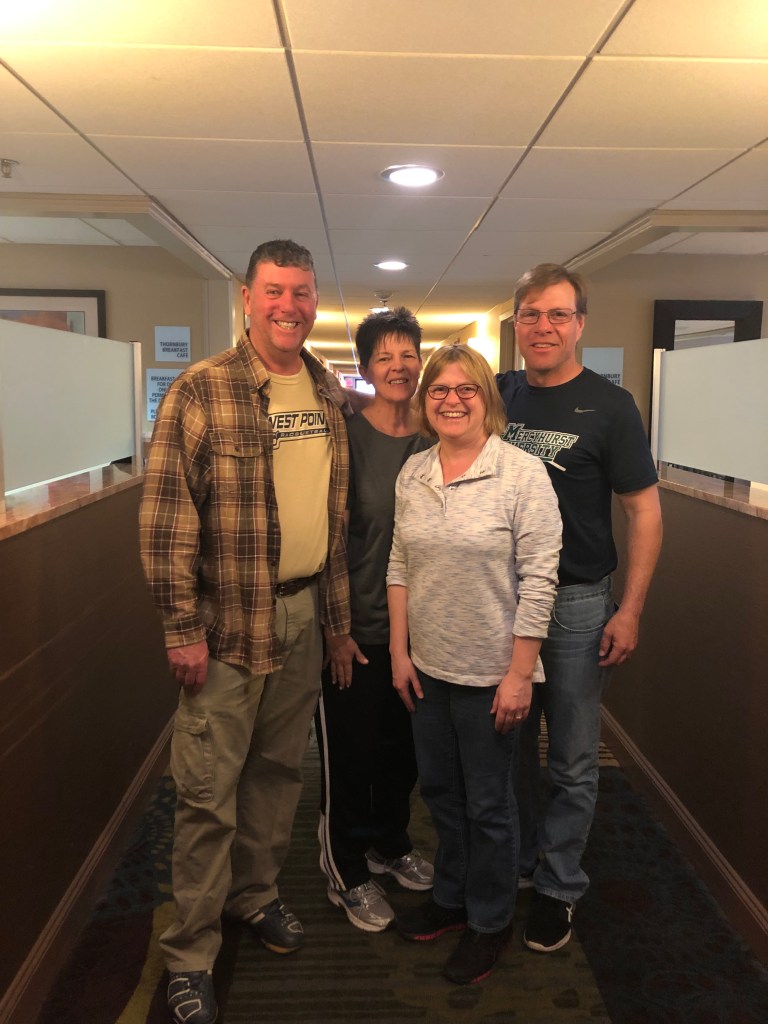 Our post game visit with Diana was brief but nice, considering the outcome of the game. After the Lakers loaded their stuff and themselves onto the bus and settled in for the long ride back to Erie, we went back to the hotel with Jane and Paul following us (no U-turns, this time). The four of us had a wonderful visit over dinner, and then back at their room. It was so nice to spend time catching up with them. We were able to extend the visit through breakfast this morning, before we both headed for home.