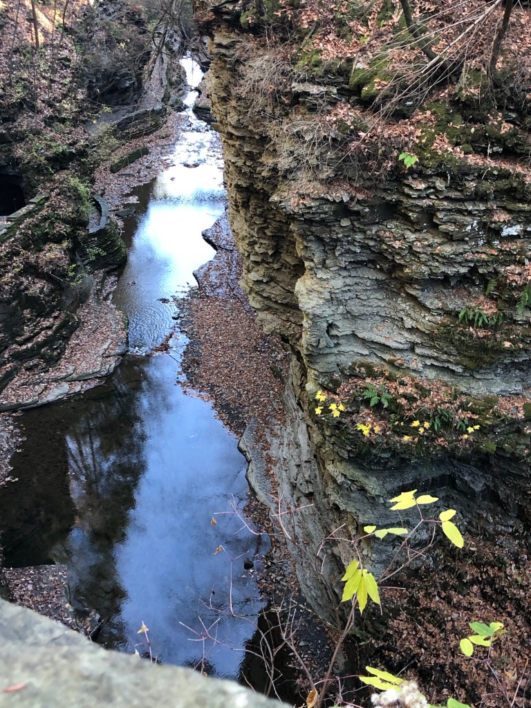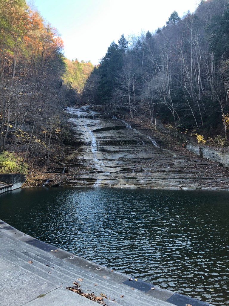 After a light lunch of Beef Jerky and Protein Bars, we travelled north and east toward the south western shore of Cayuga Lake, which is home to Trumansburg and Taughannock Falls State Park. We were pleased to encounter a much less difficult trail following along the south side of a wider, more gentle river that flows east toward the lake. Though less taxing, it was equally impressive, especially “The Falls” itself at the western edge of the park, All day we basked in the natural splendor off these state parks, treated to unseasonably warm temperatures, brilliant sunshine and intermittent showers of falling leaves.