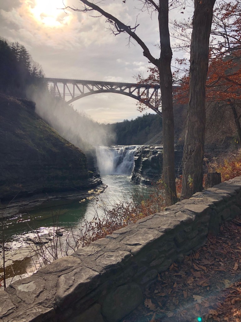 Once on the Trail, it was not long before we realized this was a special place. As we hiked south along the cliffs that border the western banks of the Genesee River, we were thoroughly impressed with the majestic scenery. These cliffs are, at times nearly six hundred feet above the River, which travels north through the “Grand Canyon of the East”! The Trail lead us through beautiful pine forests and over challenging terrain. We observed many species of birds, and spotted a few black squirrels and chipmunks. While the forest trails and the wildlife were impressive, it was the River and the Canyon that made for the most awe inspiring scenes. And of the many spectacular scenes, the three major falls, are the showstoppers! The first of them is the Lower Falls, which requires some grueling hiking (I apologize for not having a photo, I am experiencing some technical difficulty). There is a long distance before you reach the Middle Falls. By then we were no longer cold and enjoying mostly sunny skies, making the scenery, that much more breathtaking.