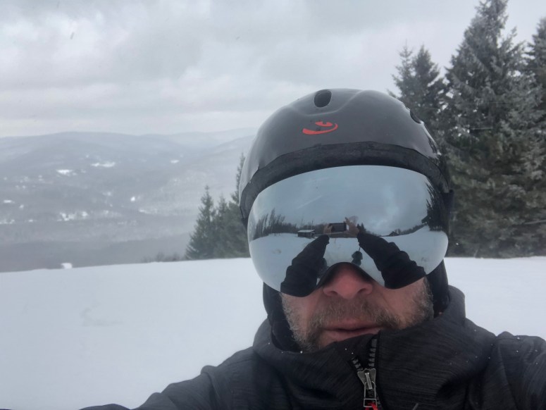 I arrived around 9am, and had decided beforehand to change in the car in order to avoid the possibility of a crowded base lodge. It was a bit challenging, but not too bad of an inconvenience. I grabbed my new gear and was on the chairlift by 9:20am. I quickly fell in love with the new goggles (purchased online for $11!), as frozen precipitation began to fall (it would continue throughout the day), and I actually forgot, that I had them on. The new Step On bindings are also, terrific. They were not purchased online, and cost a small fortune, but they are already worth it. I can get in and out of them easily, without having to sit or kneel, thereby saving my back. The snow conditions were good, especially for this early in the season, and the new board (a Burton “Speed Date”) carved beautifully, all day on any kind of terrain and all kinds of snow. I boarded through lunch and didn’t pack it in for the day until after 2pm.