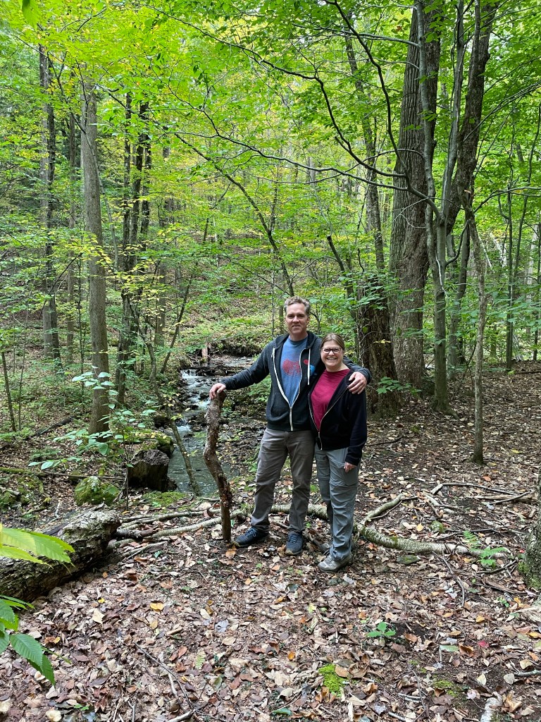 Tim arrived back out our home base for the weekend, at around 10am, bearing the gift of Fresh Cider Donuts from Bartlett’s Orchard in Richmond (yes, they were delicious!). We hopped in our car and made the short drive to picturesque Williamstown, eventually finding Hopkins Memorial Forest (which is owned and maintained by Williams College). It was cool and not long before it began to rain, though the density of the forest kept us mostly dry. We probably went more than four miles on varied terrain, up and down some moderate grades and crossing several brooks. One of the best things about Hiking, is it allows for conversation, which is a great way to visit with a cousin you don’t get to see too often.