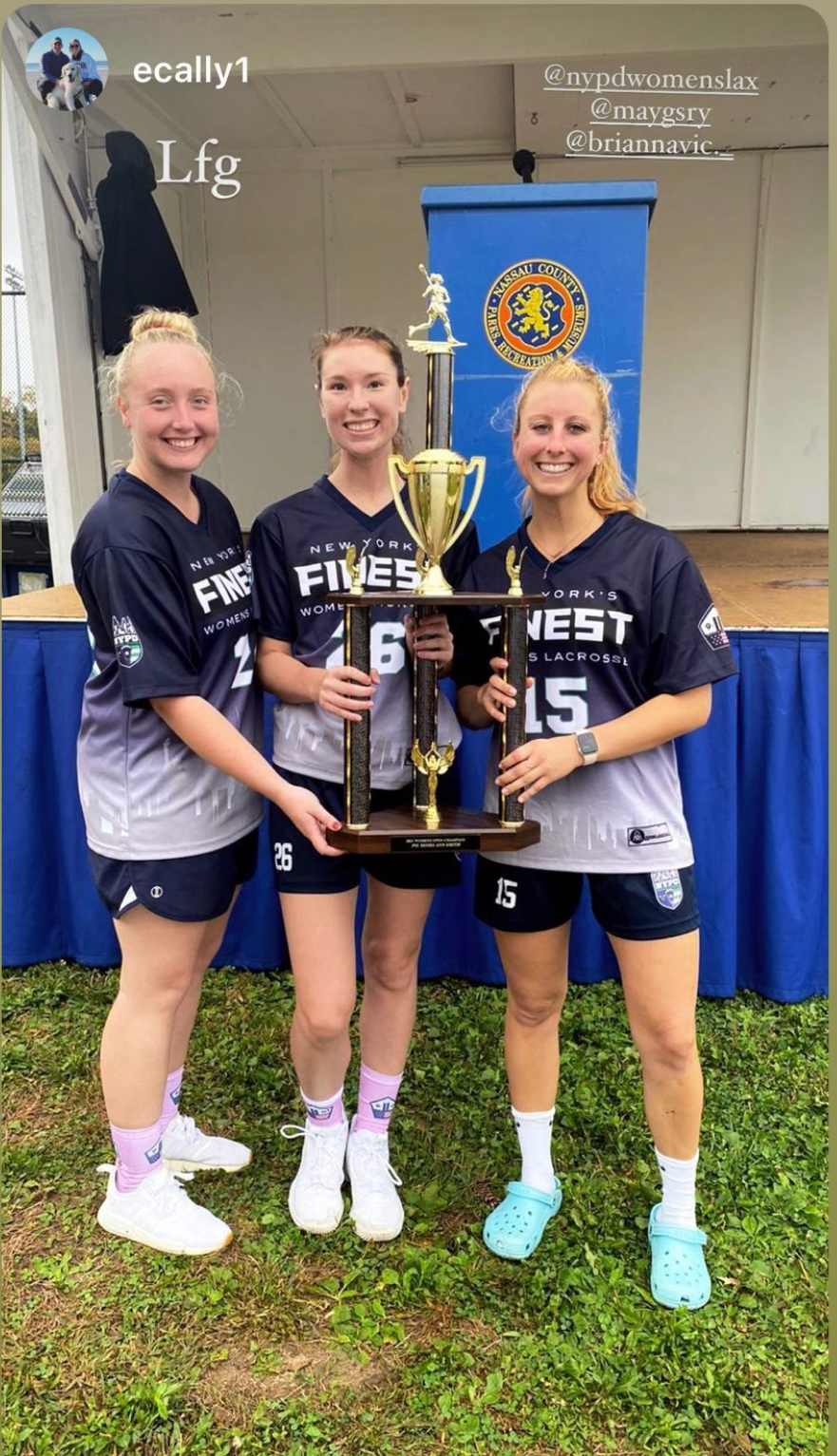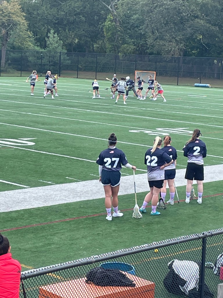 A week ago, Sunday, I got myself over to Cantiague Park by 9am, to watch some Post Collegiate Women’s Lacrosse. It was a four team Fundraising Tournament and I was there to see the NYPD’s team, which is led by former TOGZ (and Molloy College and Island Trees HS) standout, Brianna Wilson, who has already been a City Cop for more than two years. I was pleasantly surprised that the Wilsons (Mom and Dad were also in attendance) were only the first people, that I knew. Kelly Clarke, an original “Tiny TOG” (who went on to be a terrific player at Oneonta) was playing on one of the “free agent” teams. It was great to see that she still plays with a smile on her face. Her Mom and Dad were also there. Then I noticed Allie Pfeiffer, who was an East Meadow PAL Teammate of Diana’s, back when it all began, before she went on to play at IUP and then at Molloy. Her Dad, John, who was Diana’s first coach, was there with his brother Vinnie, whose daughter is also on the NYPD team. I also saw the Lyndsey Ramos’ (who had a short but illustrious TOGZ career, before becoming the four year starter and All Conference Goalie at St. Joe’s) parents, who were there watching Lyndsey’s sister, playing for the PD. It was great to see the ladies still out there, playing. I was really impressed with the product on the field and with the entire event. It was definitely worth standing in the drizzle, to see the NYPD win the Tournament in Overtime!
