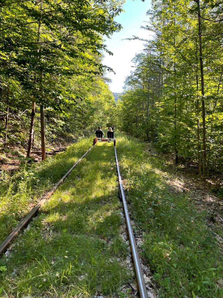 Sunday morning we had an 8am reservation for two “Rail Bikes” from the “Revolution Rail Company”, right down in the village of North Creek. This was everyone’s first “Rail Biking” experience. I think we would all agree, it was terrific!. You basically pedal your way along 7 miles of railroad , most of which is alongside the Hudson River. The weather was great and the scenery, even better!