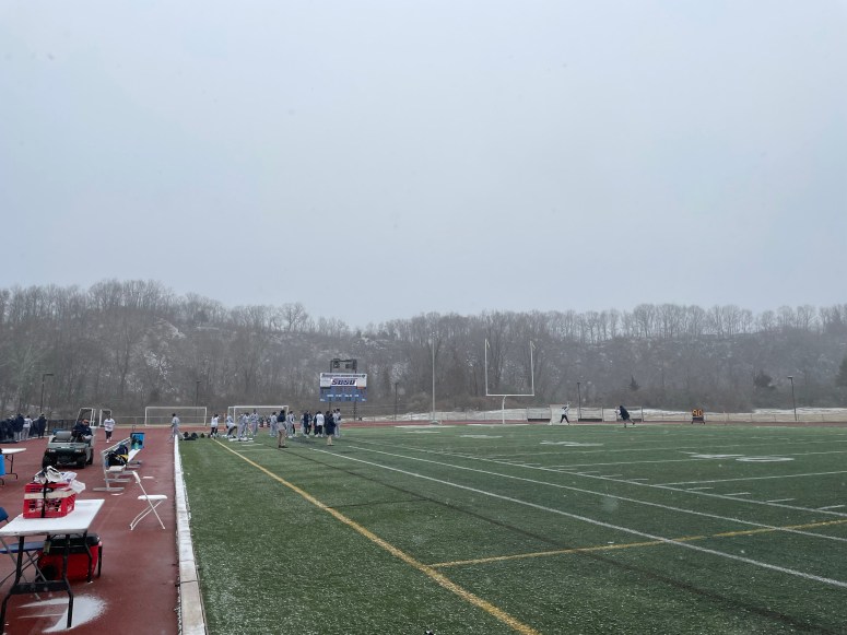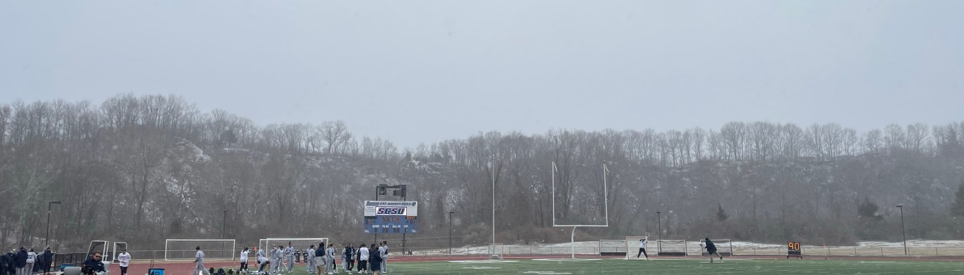 When we finally arrived at the Southern Connecticut Campus, we quickly got dressed and began a hurried and necessarily shortened, pre-game warm up. The temperature was in the mid-twenties and snowing. Once again, not ideal conditions.