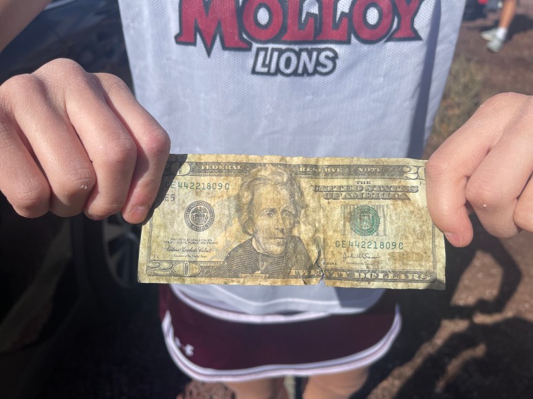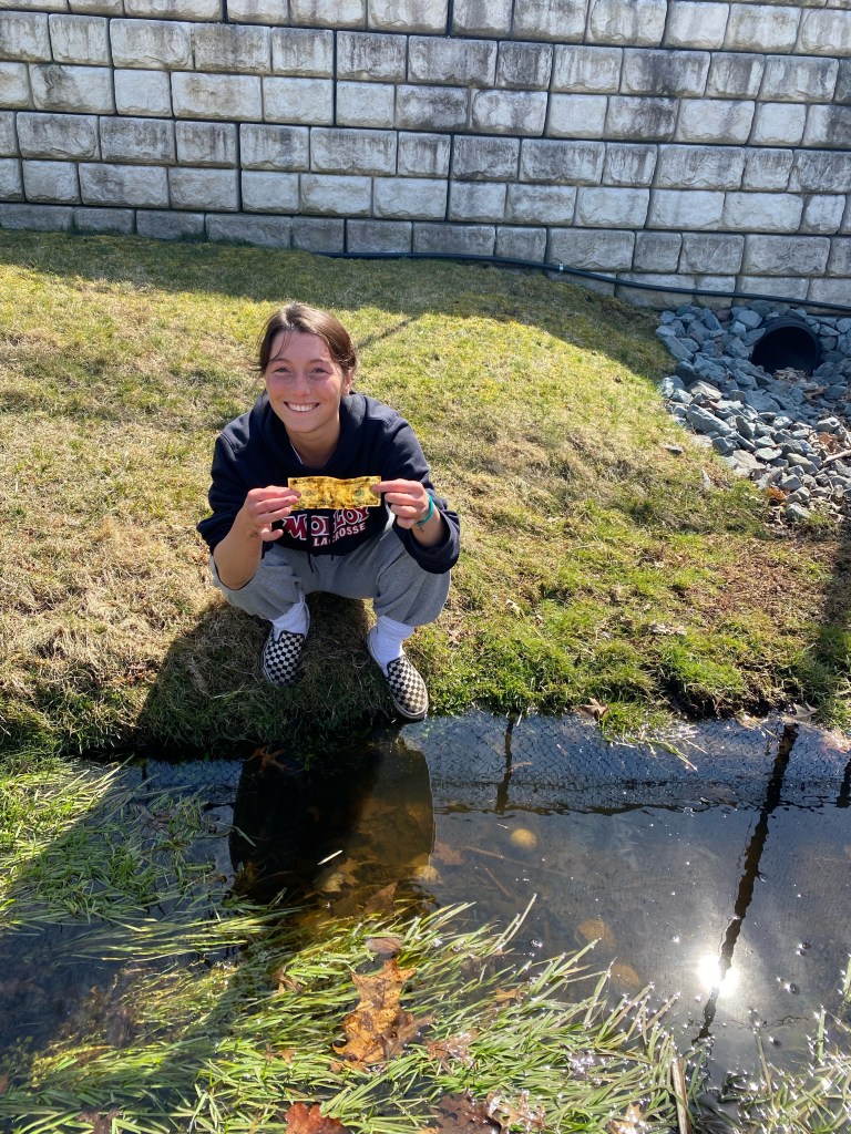 We had a nice ride up to STAC. The beautiful weather highlighted the natural splendor of the Palisades Parkway overlooking the Hudson River. We pulled onto the STAC campus with some time to kill, so we leisurely checked out the Men’s Lacrosse Game against Frostburg State. The Lady Lions made friends with the Frostburg supporters and later, some of the players. While most of the team was soaking up Vitamin D on the sideline a few of the ladies were exploring the creek that runs behind one end of the field. Amanda “Huckleberry Finn” Weber found snail shells, a golf ball with a leech on it and a twenty dollar bill!