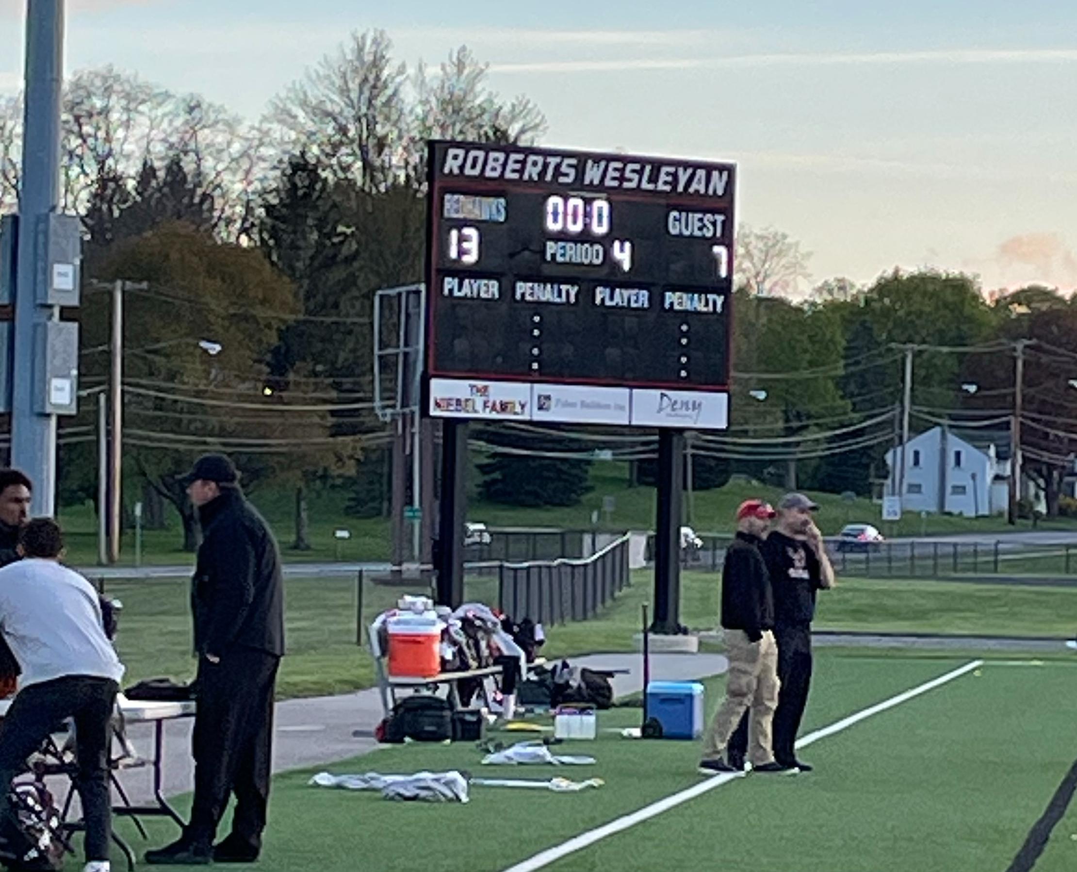 We had a decent practice, in what turned out to be our last practice at home, on Tuesday. The weather was lousy and I thought we were all somewhat pre-occupied with the upcoming bus trip back up to Roberts Wesleyan in Rochester, for Thursday’s ECC Semifinal. We departed on time, Wednesday morning, and were doing fine, until we reached the Delaware Water Gap, where we encountered the first of several heavy delays, due to Construction. To make matters worse, our bus developed a coolant leak, which forced us to stop twice, to add more. So, we only got to the hotel at 5:30pm (we left at 9am!), with very little time to have dinner, before going over to RWU, for our 6:30 practice slot! After such a long day on the bus, it was good for the ladies to be out on the field, running around.