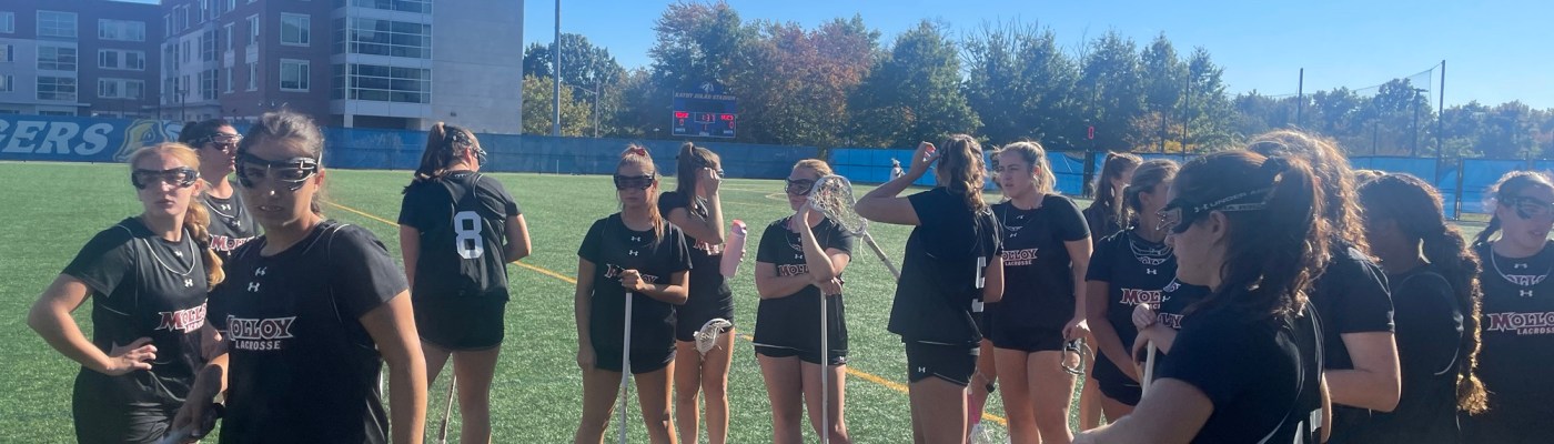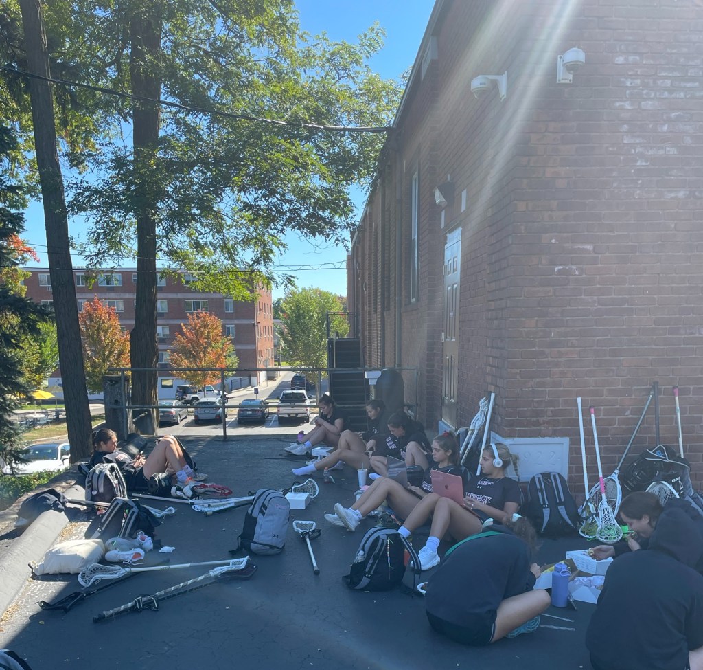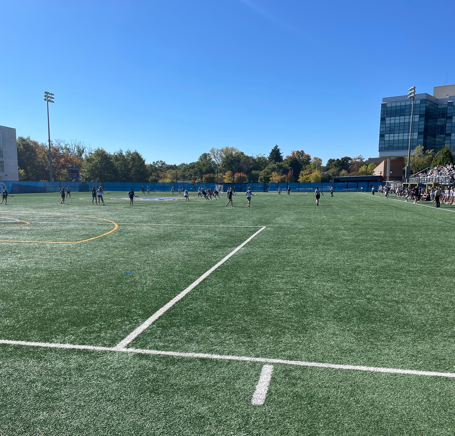 It was a beautiful day for lacrosse and we made great time, driving up to New Haven. Our first game was against the Dominican University Chargers. They are a good team and a familiar foe, as we have played them many times during fall, in the past. It is good for us to play them, since they employ a “backer zone” defense, which is something we will see during our conference schedule in the spring.