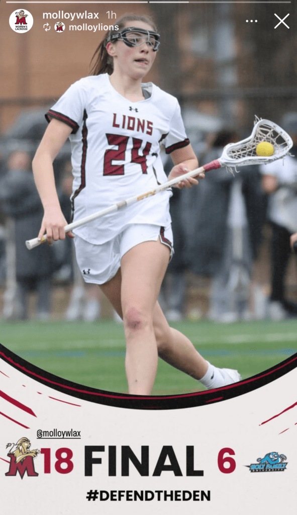 Yesterday (Wednesday), was game day and by game time the weather was windy and rainy, though there appeared to be clear skies on the horizon, to our west. As the Lady Lions took the field, in a Non-Conference Game, against the Tigers of Holy Family University, I could not help being a bit nervous. I was concerned that we would once again, underperform against, what, on paper, appeared to be a weaker opponent. But the Lions came out of the gate, roaring, scoring early and often! By the end of the first quarter, we had built a 7 – 1 lead, which by halftime had grown to 11 – 3. Molloy was able to keep the pressure on the visiting Tigers in the second half, as the Lions cruised to a convincing 18 – 6 home victory! We had nine different players score goals, on the day!